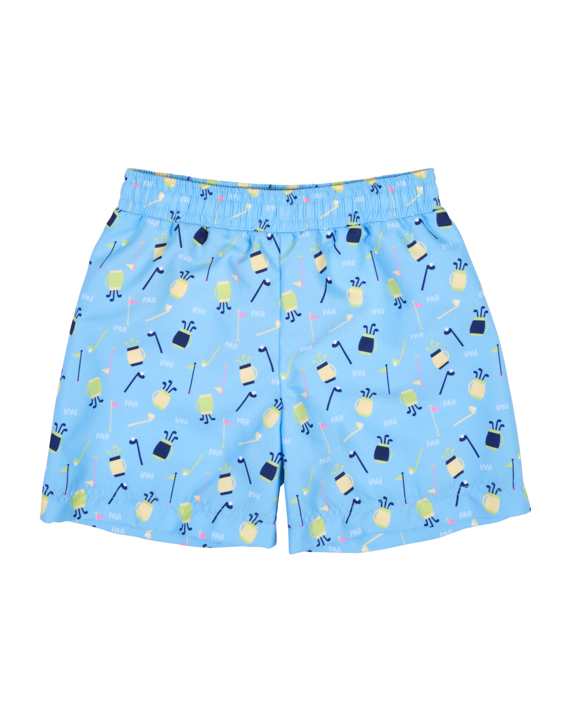 Perfect for sunny days on and off the shore, these swim trunks feature a playful blue and multicolor golf print on quick-drying supplex fabric. Crafted from 100% polyester, they’re lightweight, durable, and ready for all-day adventure.