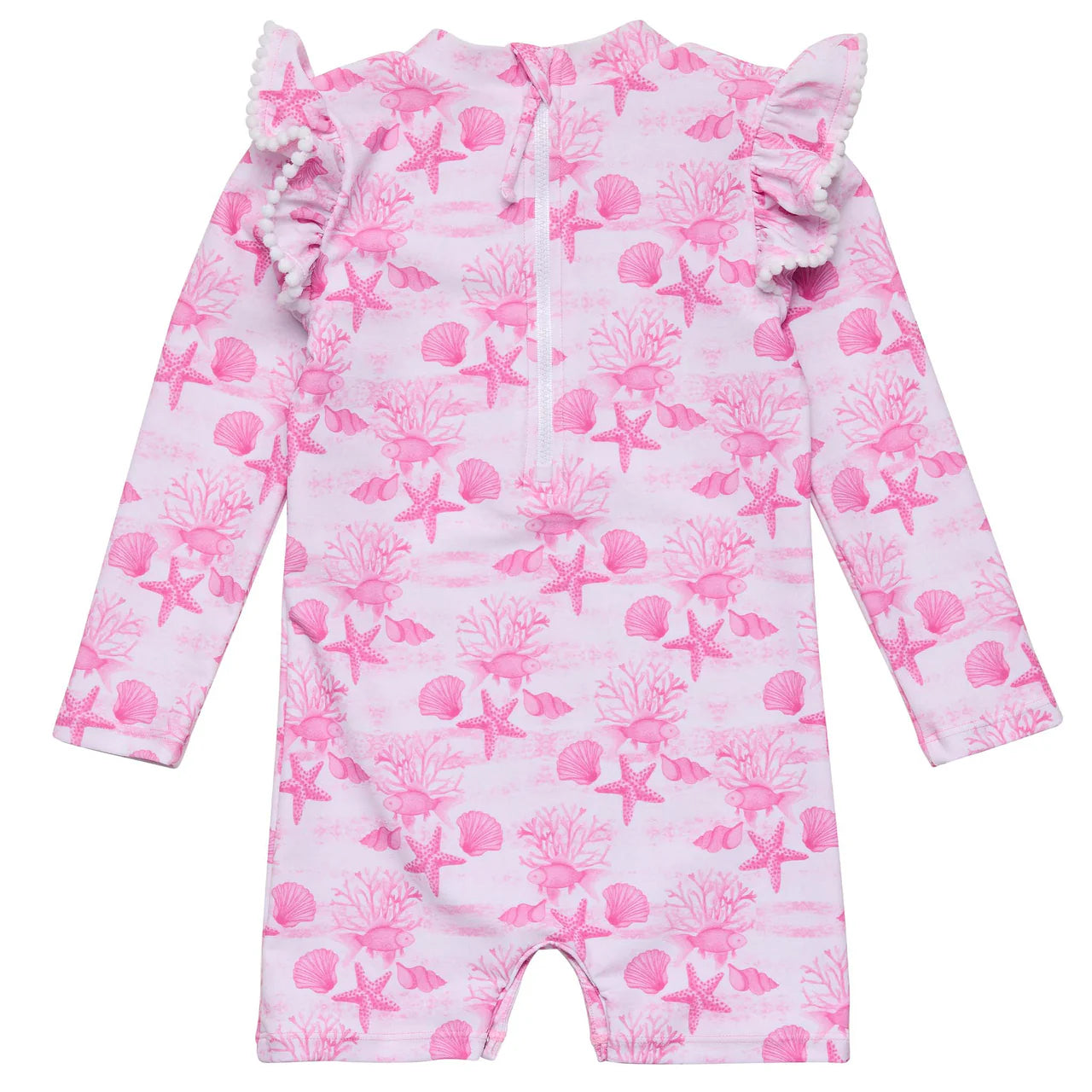 Made for magical beach days. The Pink Lagoon LS Sunsuit wraps your little one in soft, storybook charm with its dreamy underwater print, featuring sweet seashells, coral branches, fish, and starfish all in gentle shades of pink.