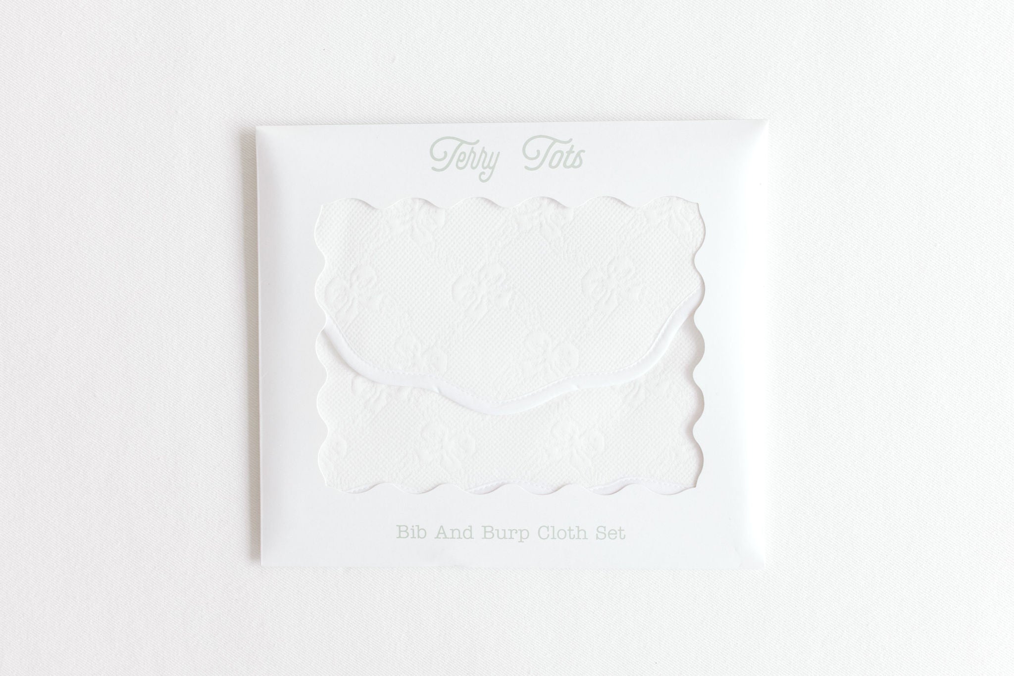 Bibs measure 9” x 10” and burps measure 9.5” x 17”