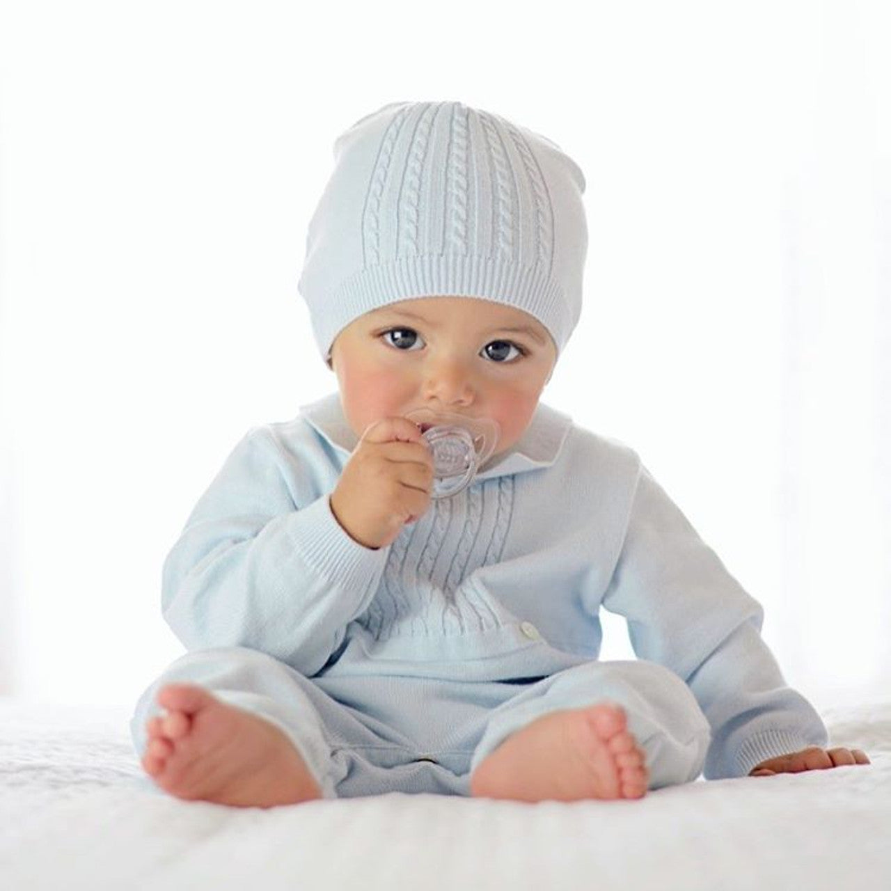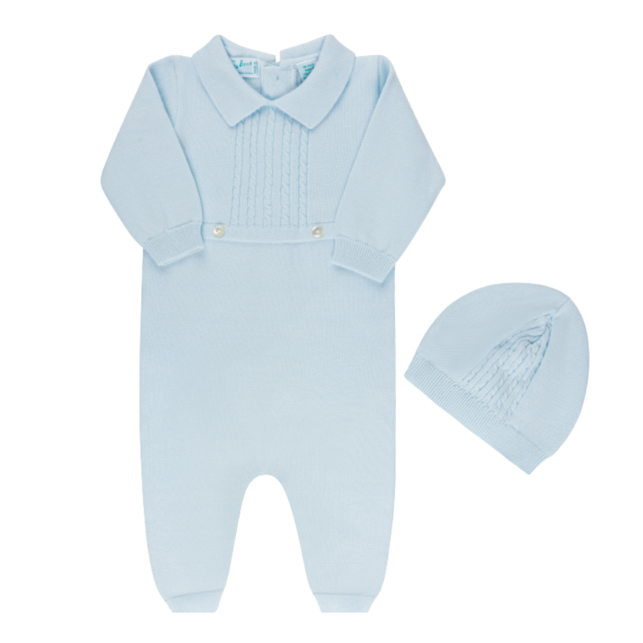 A classy one piece outfit designed with your baby boy in mind! The Cable Knit Longall is available in soft blue, with a pointed collar and ribbed edges at the sleeve and leg cuffs. The bodice features rows of cable knit ending in a waistline with two sweet little buttons for a mock tuxedo look. Includes a matching cable knit hat to keep Baby warm and complete the look. A beautiful heirloom set for your prince!