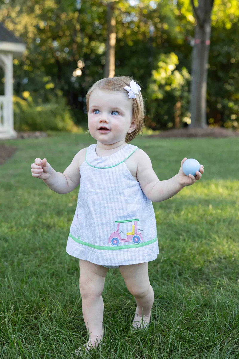 Charming and playful, this skirted romper is crafted from blue and white check seersucker in soft, breathable 100% cotton—perfect for warm-weather days away. A cheerful appliqué golf cart adds a sporty touch, while contrast cording at the neckline and delicate spaghetti trim at the hem give the look a polished finish.