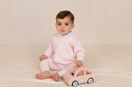 This timeless knit set is perfect for your little princess! In our signature pink color with dainty rosebud embroidery across the cable knit design and a peter pan collar.