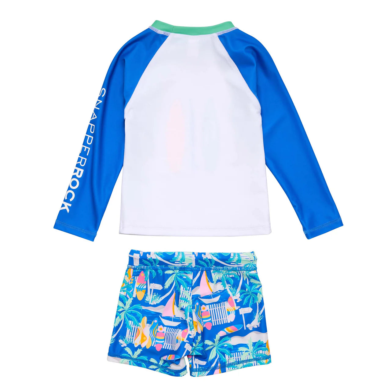 Ready for sun, splashing, and serious fun, the Breakwater Beach LS Set is your go-to for summer adventures. The long sleeve rash top features bright blue raglan sleeves, a mint collar, and bold surfboard graphics, while the printed shorts bring the beach vibes with retro surfboards, sailboats, and swaying palms.