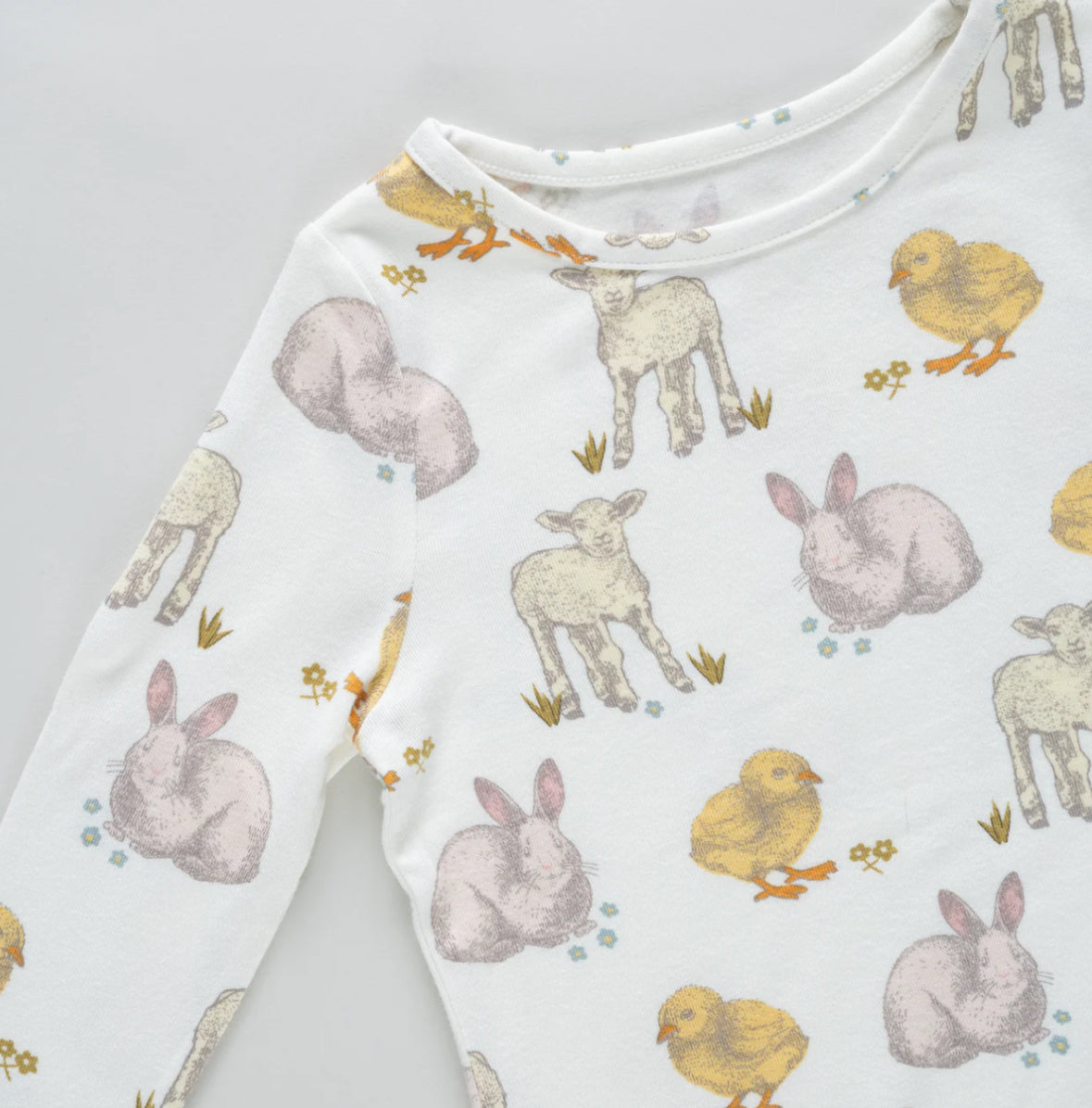 Soft, cozy, and made for Easter mornings! Our classic Kids Bamboo PJ Set features a playful bunny and chick print crafted from ultra soft bamboo fabric with added stretch. Each 2 piece set includes a long sleeve top and elastic waist pant, designed to keep littles comfortable for bedtime, lounging, and slow spring mornings.
