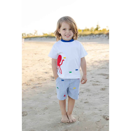 Made for sunny days and seaside play, this white interlock knit shirt is crafted from soft 100% cotton. A cheerful appliqué octopus and fish bring bright, ocean-inspired charm, while a royal blue neck band adds a clean, sporty finish.