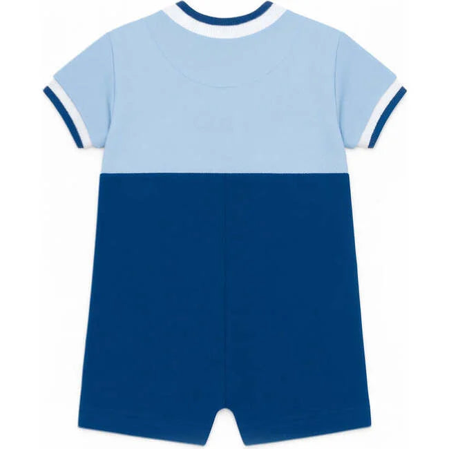 Full of seaside imagination, this shortall is crafted from soft light blue and royal interlock knit in 100% cotton. A playful appliqué pirate ship sails across the front—complete with a cheerful crab and a peek of a shark fin—bringing whimsical adventure to warm-weather days.