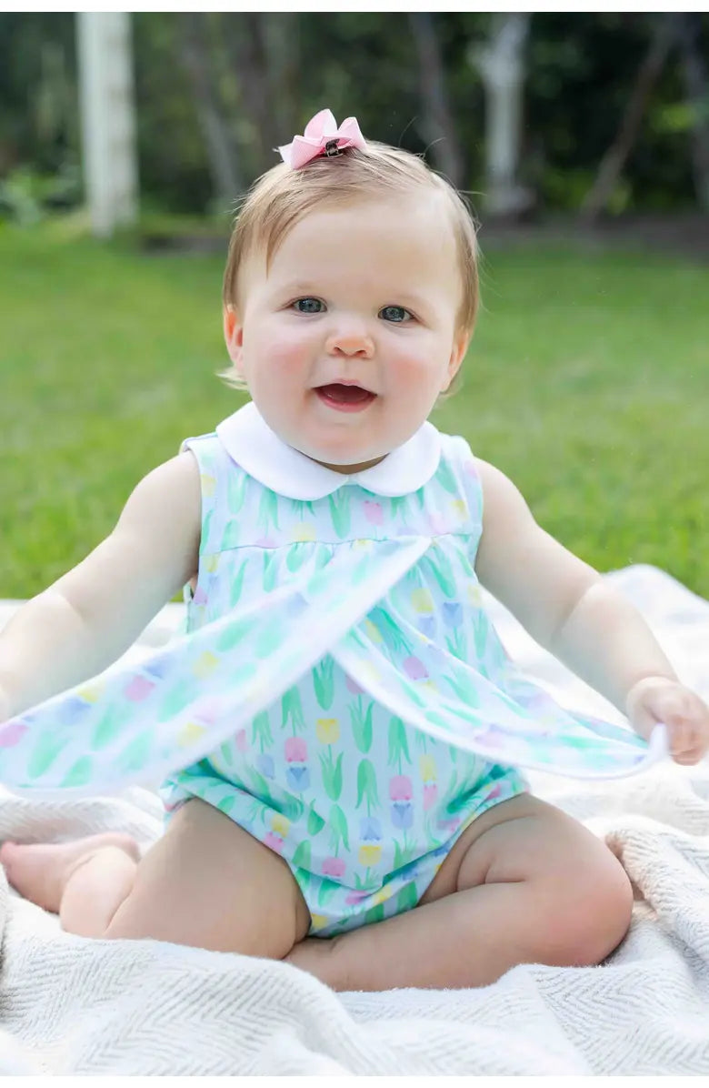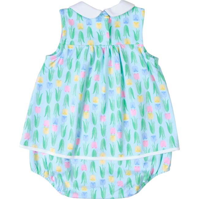 Pastel blue, yellow, pink, & green tulip print jersey knit