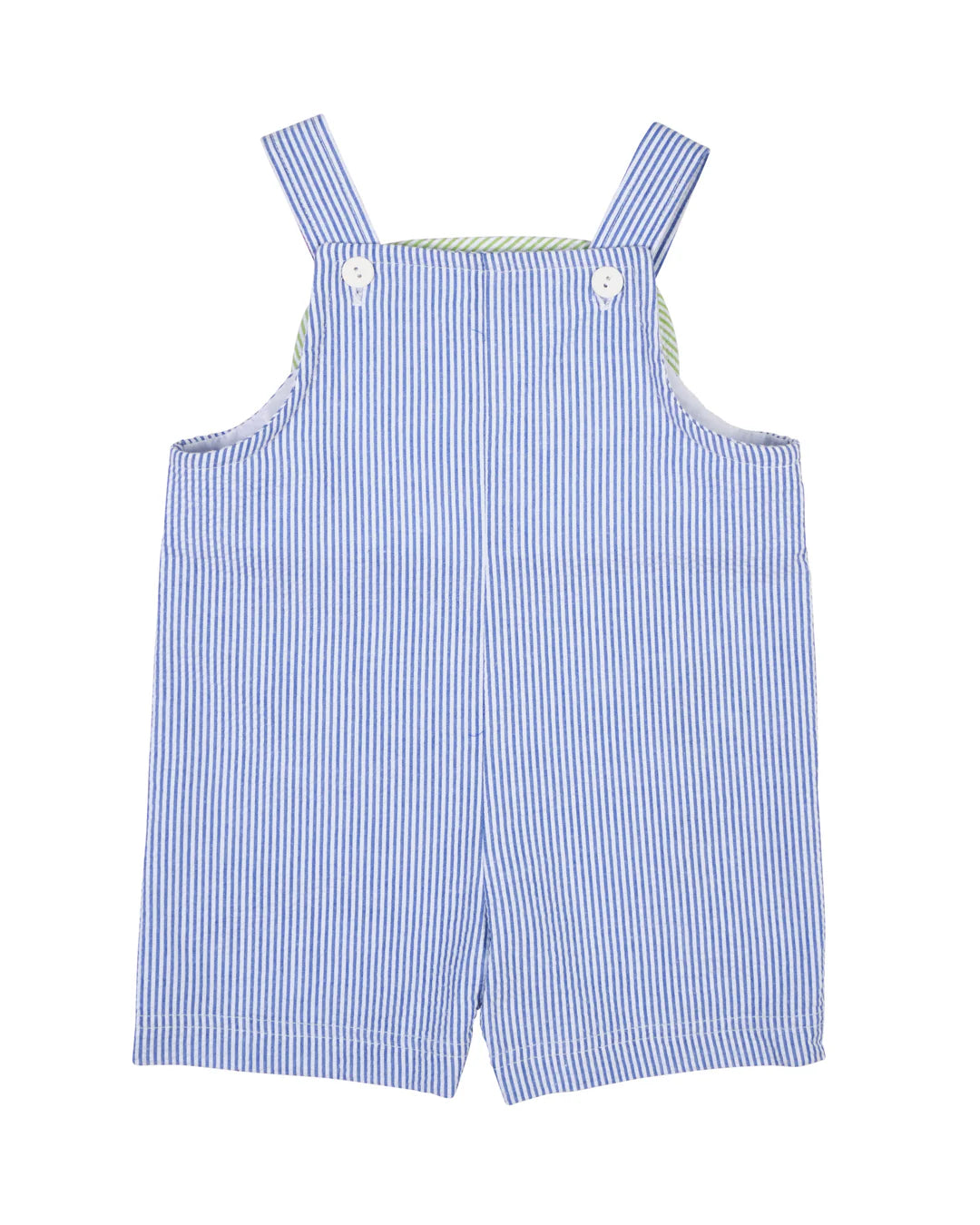 Playful and full of color, this shortall is crafted from royal and white stripe seersucker for a lightweight, breathable feel perfect for warm-weather days. Multicolor appliqué cars race across the front, accented by lively lime stripe binding for a fun, vacation-ready look.