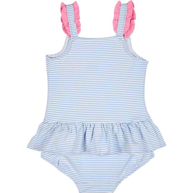Sweet, sunny, and made for splashing, this skirted tank suit is crafted from light blue and white stripe seersucker swim fabric with gentle stretch for a comfortable, secure fit. Bright appliqué flowers bloom across the front, while ruffled straps add playful charm.