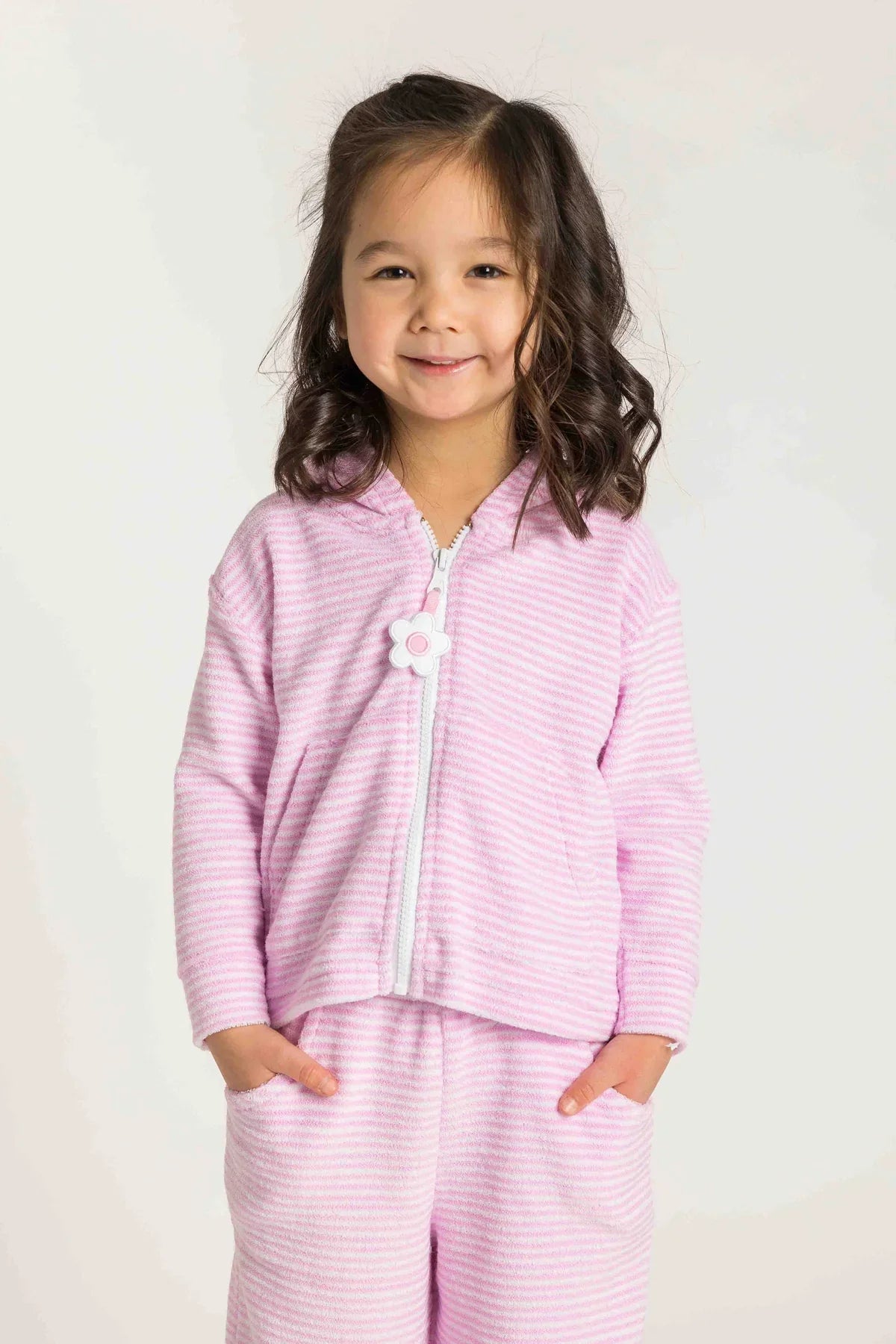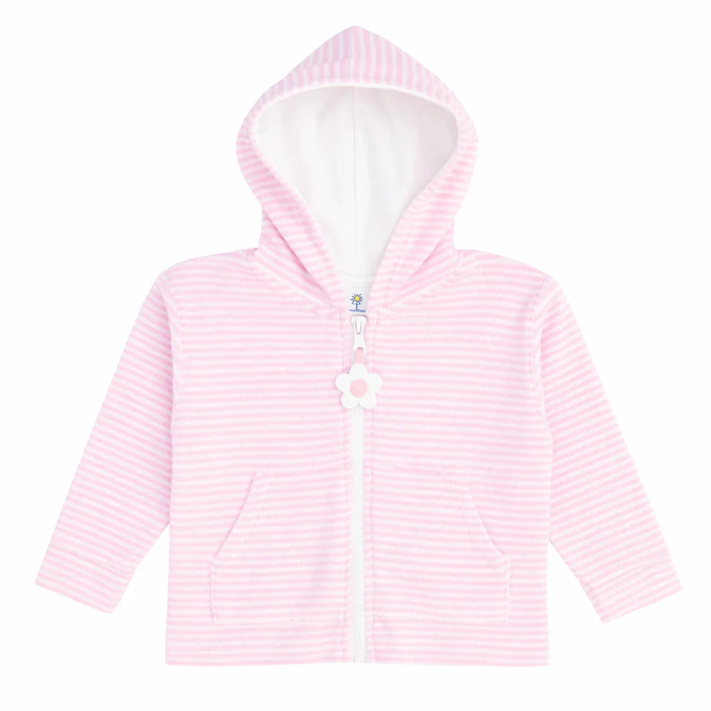 Soft and sweet for sunny days by the water, this hoodie is crafted from pink and white stripe terry cloth in a cozy cotton blend. A charming flower zipper pull adds a playful touch, while the lightweight terry fabric makes it perfect for layering for convenient post-swim vacation moments.