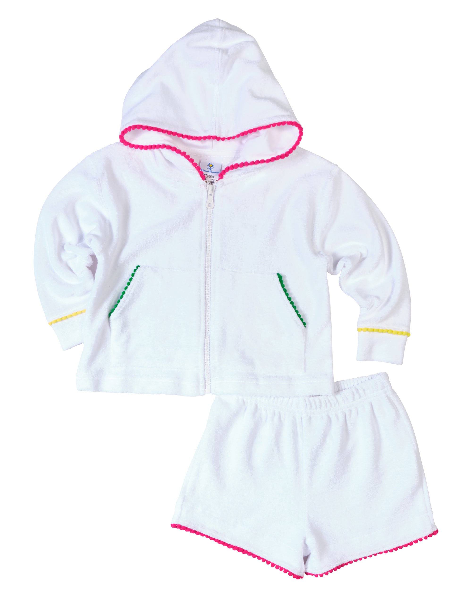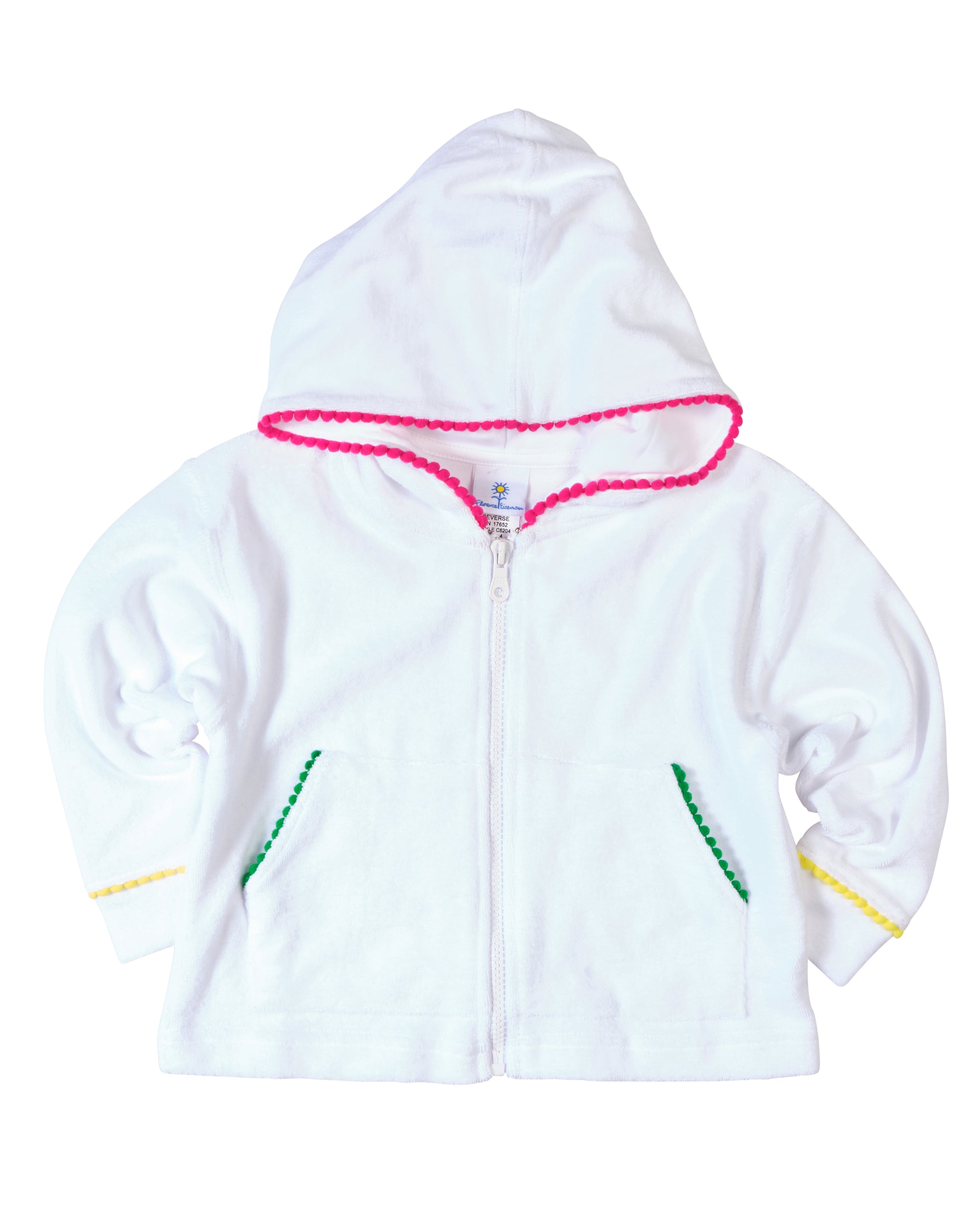 Soft and cozy with a pop of color, this hoodie is crafted from white terry cloth in a comfortable cotton-blend—perfect for layering after a swim or during breezy vacation evenings. Cheerful yellow, pink, and green pom poms add playful charm, while a front zipper makes it easy to slip on and off.