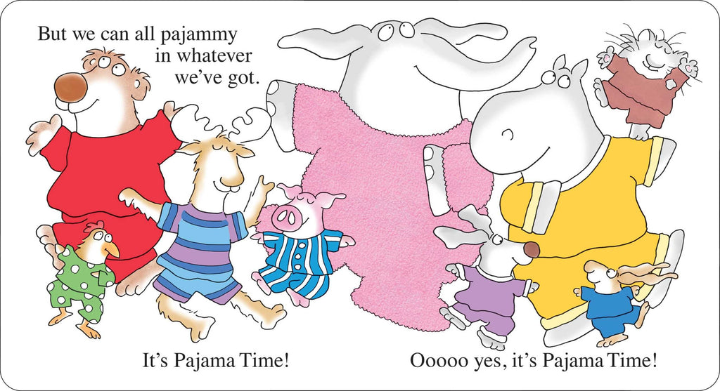 A jump-roping chicken and a pig on a swing. A moose in striped pajamas and an elephant in a fuzzy one-piece with feet. And in sing-along nuttiness reminiscent of Barnyard Dance!, it’s time for the animals to put on their jammies and get ready for bed.