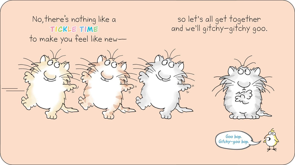 Based on the wildly popular song from Boynton’s wildly popular Rhinoceros Tap book and CD set, Tickle Time! is pure irrepressible Boynton: lively in tempo, nimble in rhyme, and filled with irresistible fuzzy cats that cavort from page to page. Plus a few birds, who aren’t the cavorting type. Here’s a book guaranteed to elicit giggles. GOTTA GITCHY-GITCHY GOO!