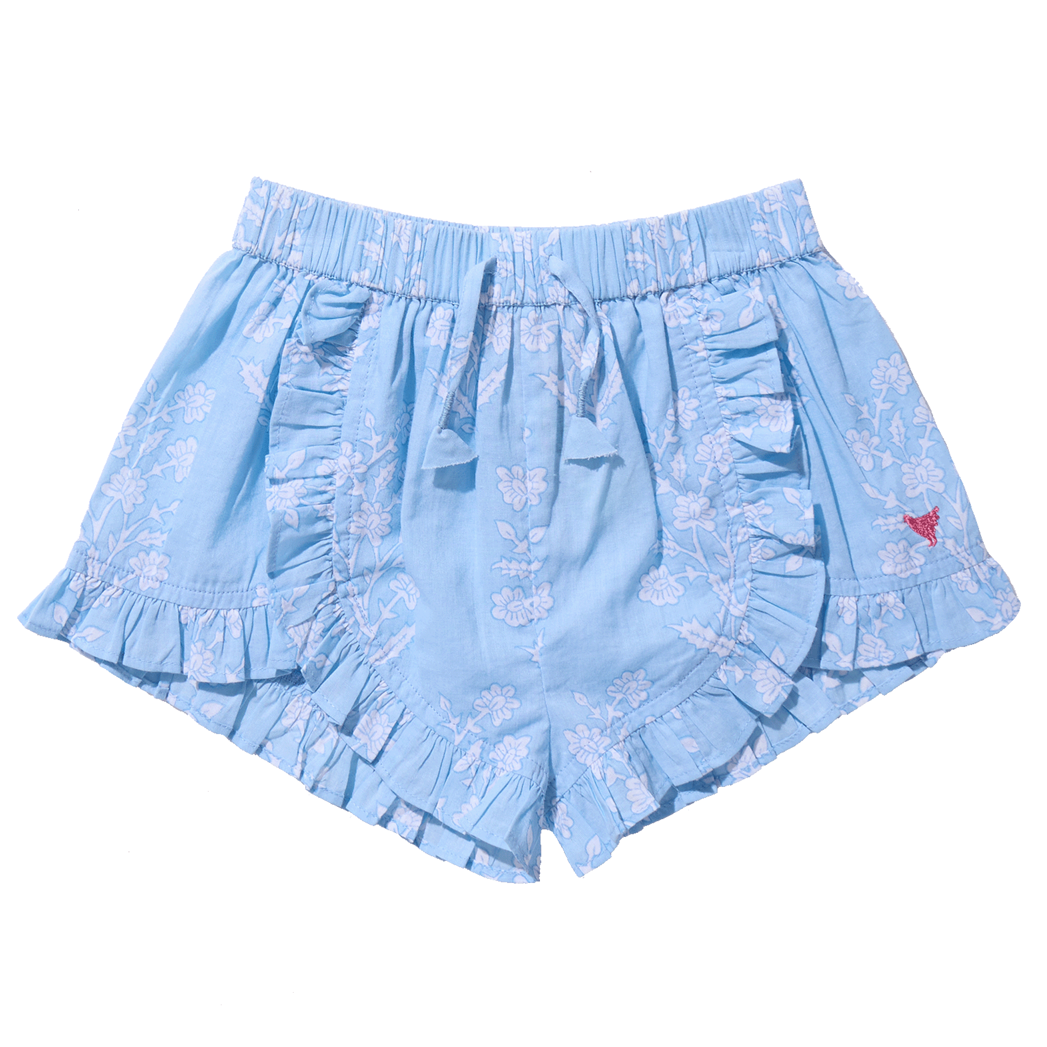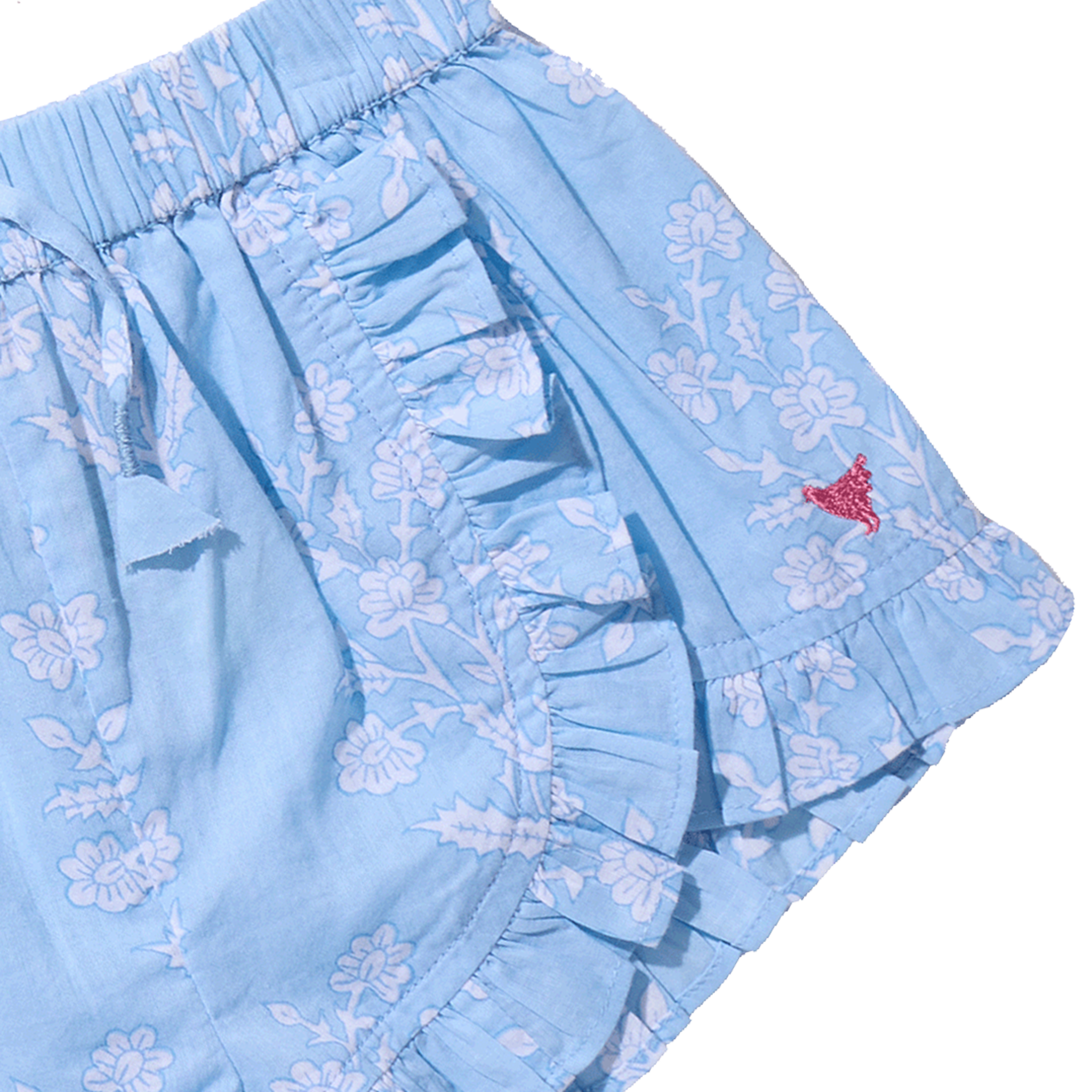 Sweet with just the right amount of swing. The Millie Ruffle Short in Blue Dewdrop Blockprint features a soft elastic waist and flouncy ruffle hem that adds playful movement. An attached bow at the waist, finished with thread-wrapped ends, gives this silhouette thoughtful detail.