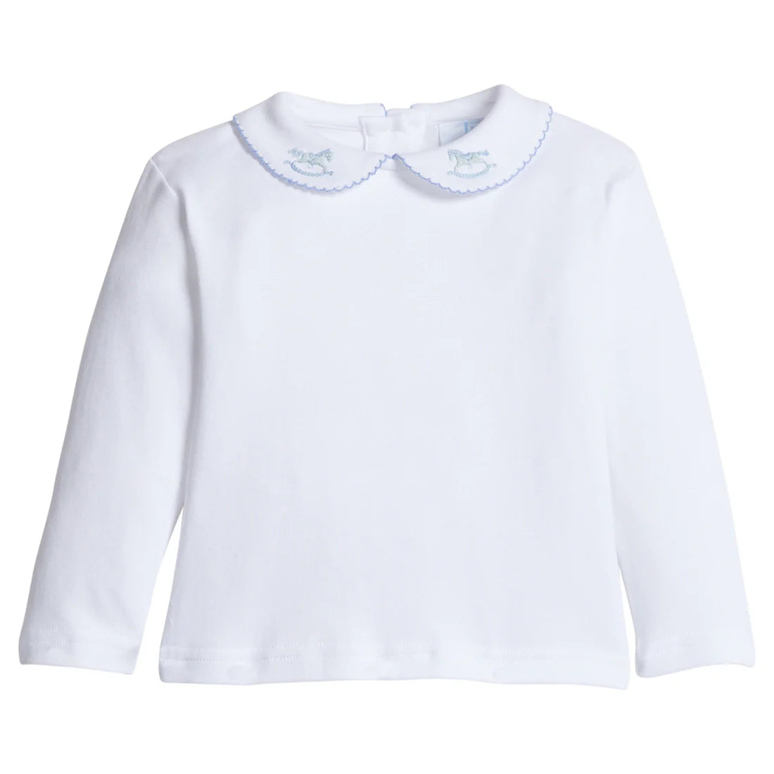 Saddle up for Fall with our Long Sleeve Pinpoint Shirt - Blue Rocking Horse! Made from 100% cotton knit, this sweet shirt features light blue picot trim around the peter pan collar with two tiny blue rocking horses. Pair with our Pointelle Knit Bubble in Light Blue for a precious outfit both mom and baby will love.