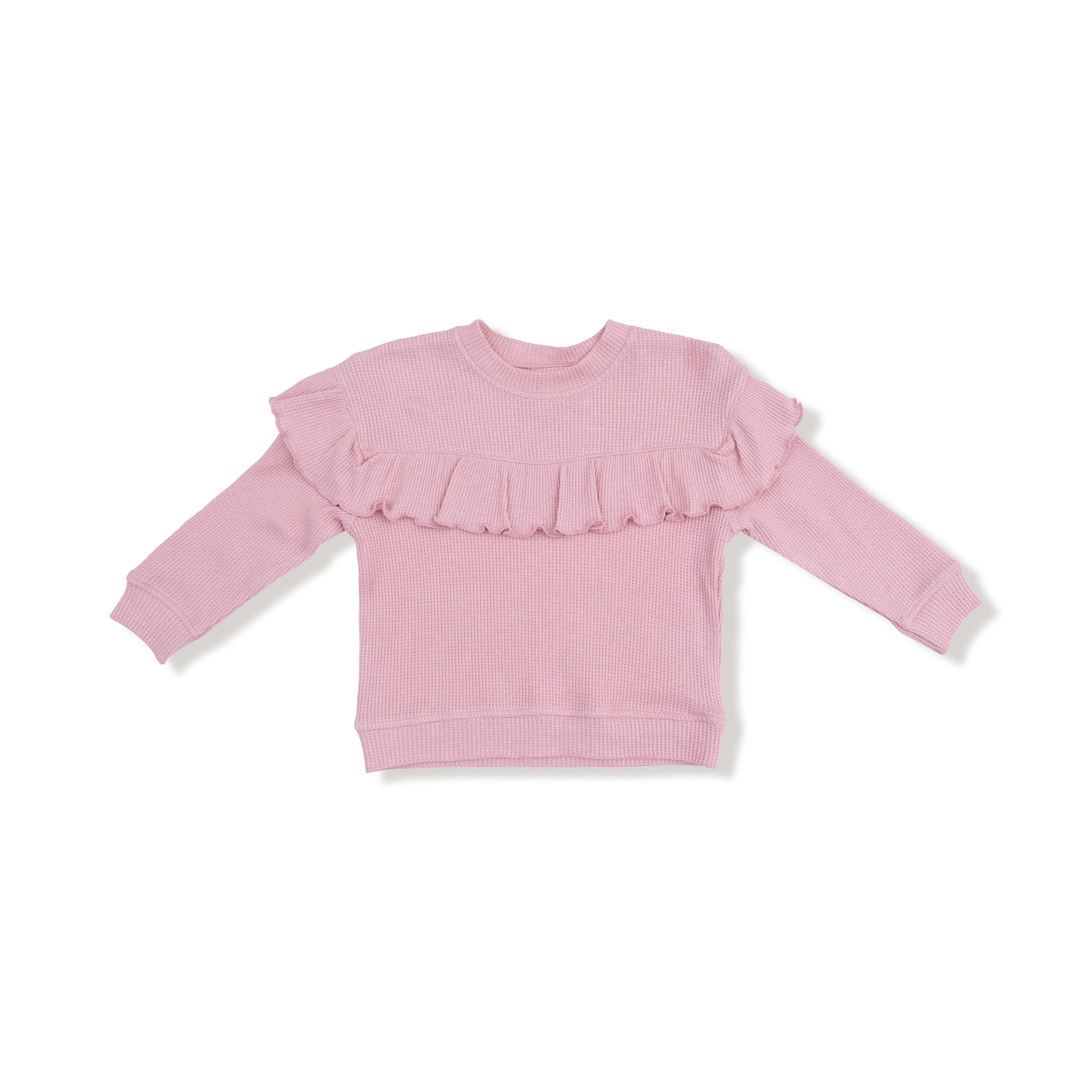 Waffle Knit Top: Warm, textured fabric with sweet ruffle details