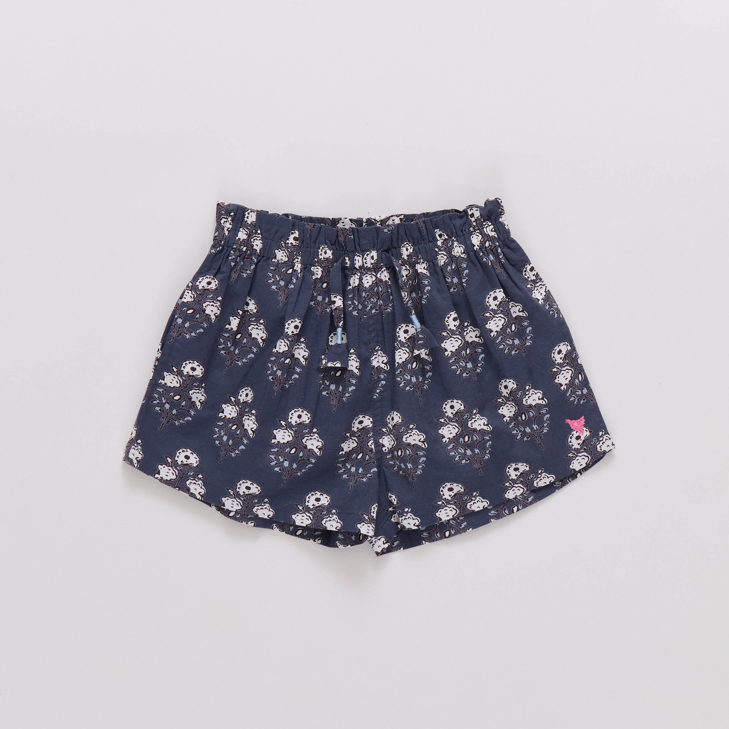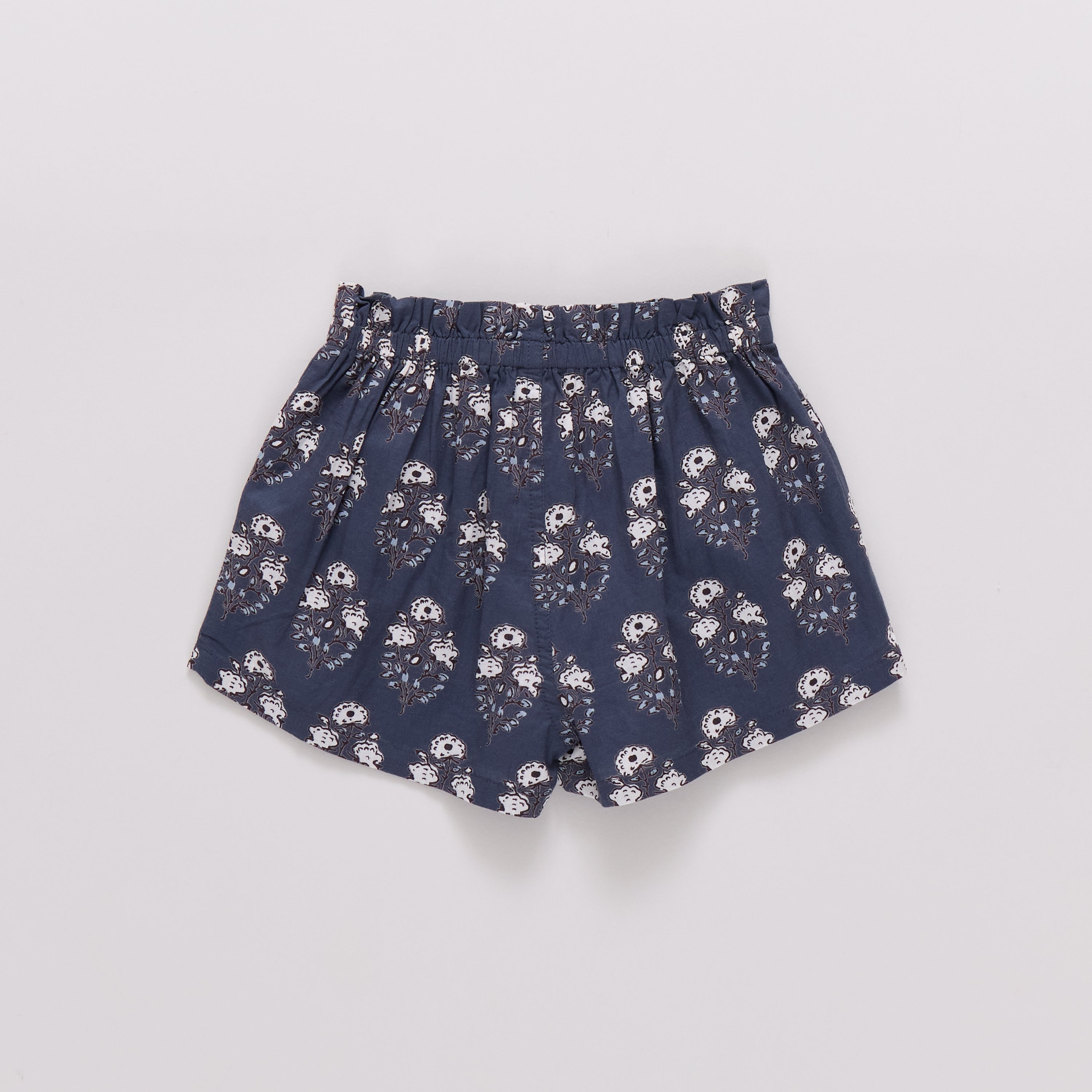 Our Girls Theodore Short in Navy Strawflower Block Print brings a hint of nostalgia to spring days. scalloped waist and vintage blooms