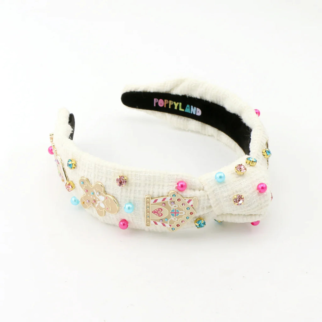 Our Gingerbread House headband features a beautiful tweed fabric with custom enamel charms of gingerbread houses made out of glitter, gems, and jewels. Perfect to top any holiday outfit! At Poppyland, a kingdom of cuteness, we believe in adding a touch of whimsical elegance to your ensemble. This eye-catching accessory effortlessly combines festive charm with sophisticated style, making it a must-have for your holiday celebrations. Elevate your seasonal look with a piece that's as unique and delightful as the season itself.