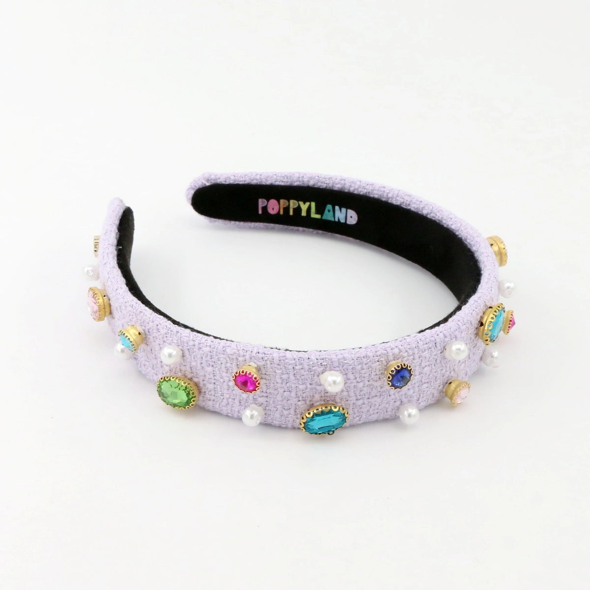 Simple but still stunning, our Light purple Tweed Bejeweled headband has a mix of colorful jewels, making it an eye-catching addition to any outfit. Designed for those who cherish elegance with a touch of whimsy, this headband seamlessly blends sophistication and playful charm. Elevate your accessory game with this unique piece from Poppyland, a kingdom of cuteness. Perfect for any occasion, it's a must-have for your collection.