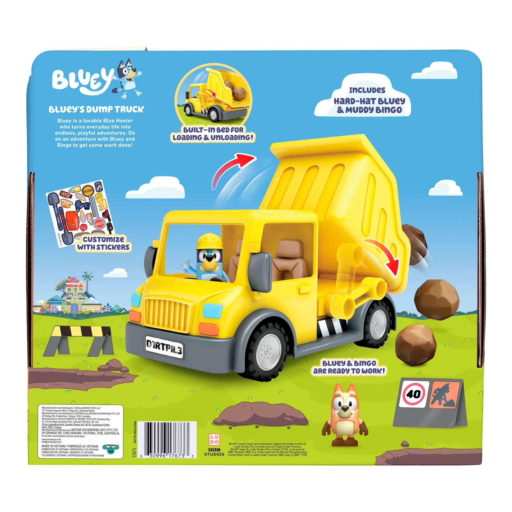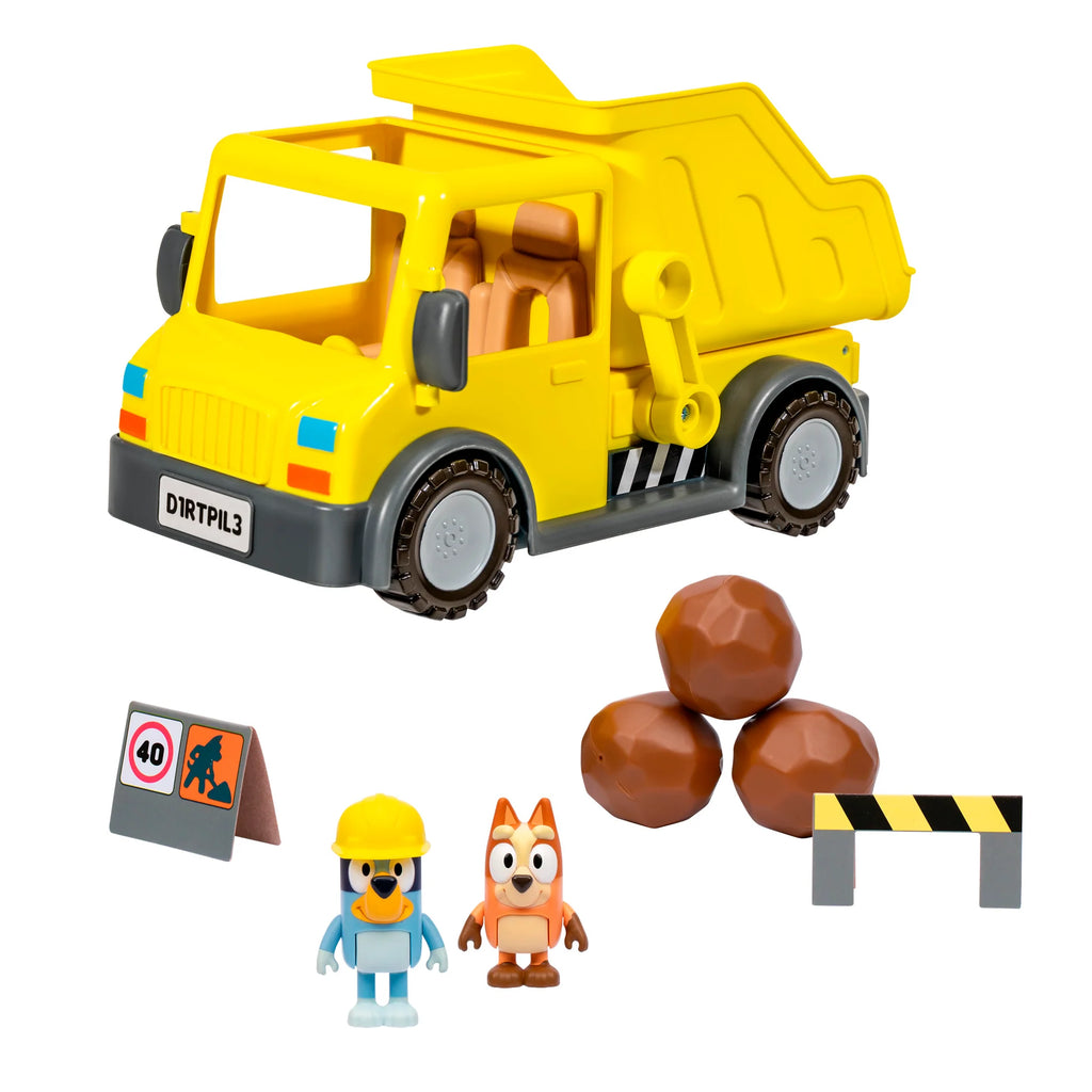 Bring construction fun home with the Bluey Outdoor Dump Truck Toy Playset! Perfect for preschoolers, this durable dump truck includes exclusive Bluey and Bingo figures, 3 toy boulders, safety signs, and a sticker sheet for customization. The working truck features a movable lever to tilt the bed for realistic loading and dumping play. Bluey wears a hard hat, and Bingo is ready for muddy adventures—both figures have articulated limbs and fit inside the truck cabin. Designed for imaginative play and storytelling, this construction-themed set encourages creativity, motor skills, and role-play fun. Ideal for kids ages 3 and up.